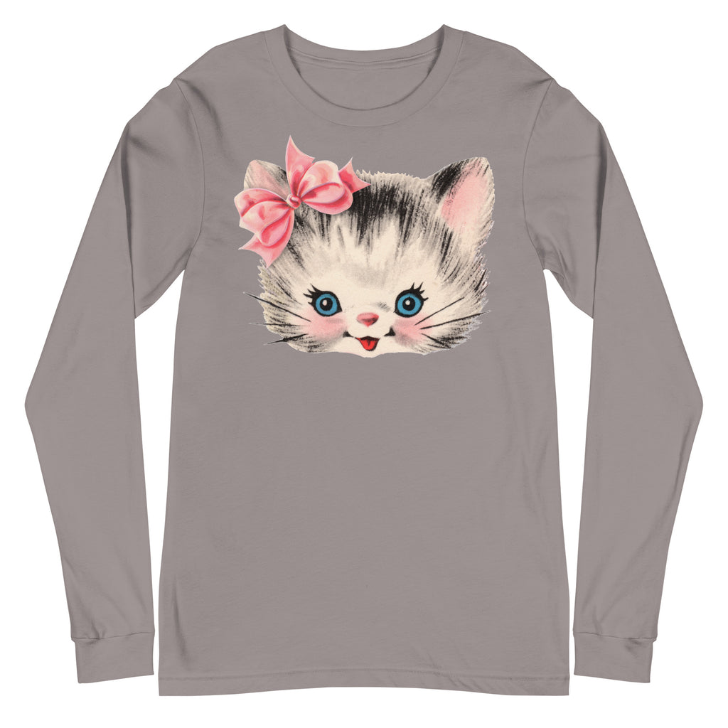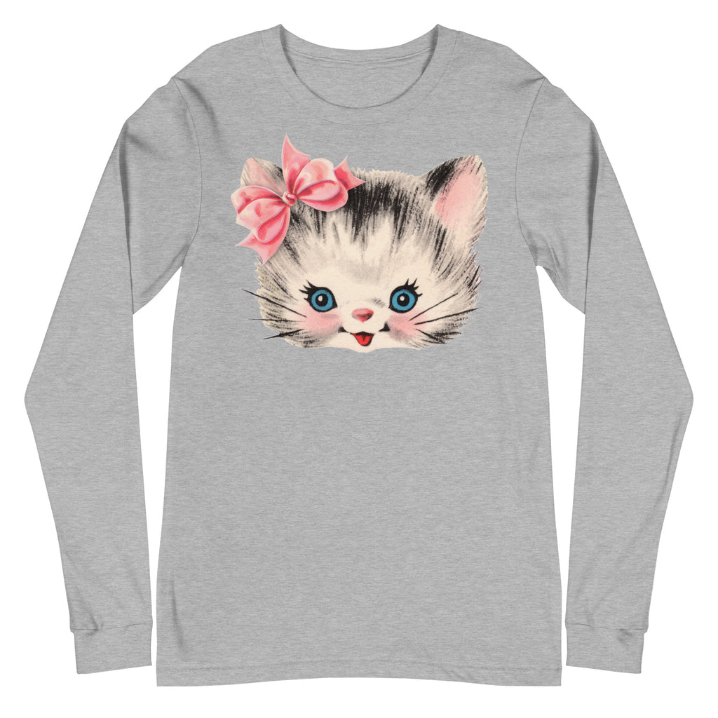 Adorable Kitsch Kitten with Pink Bow, in a comfy long-sleeve t-shirt.
