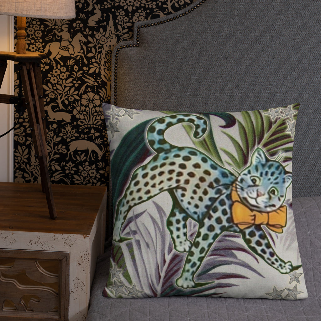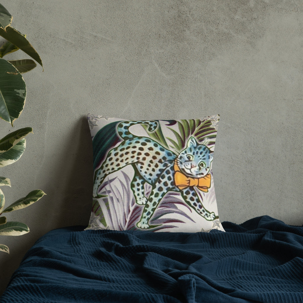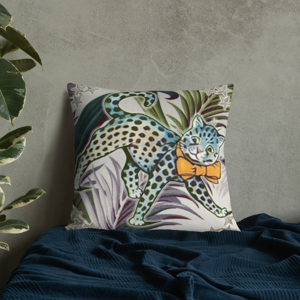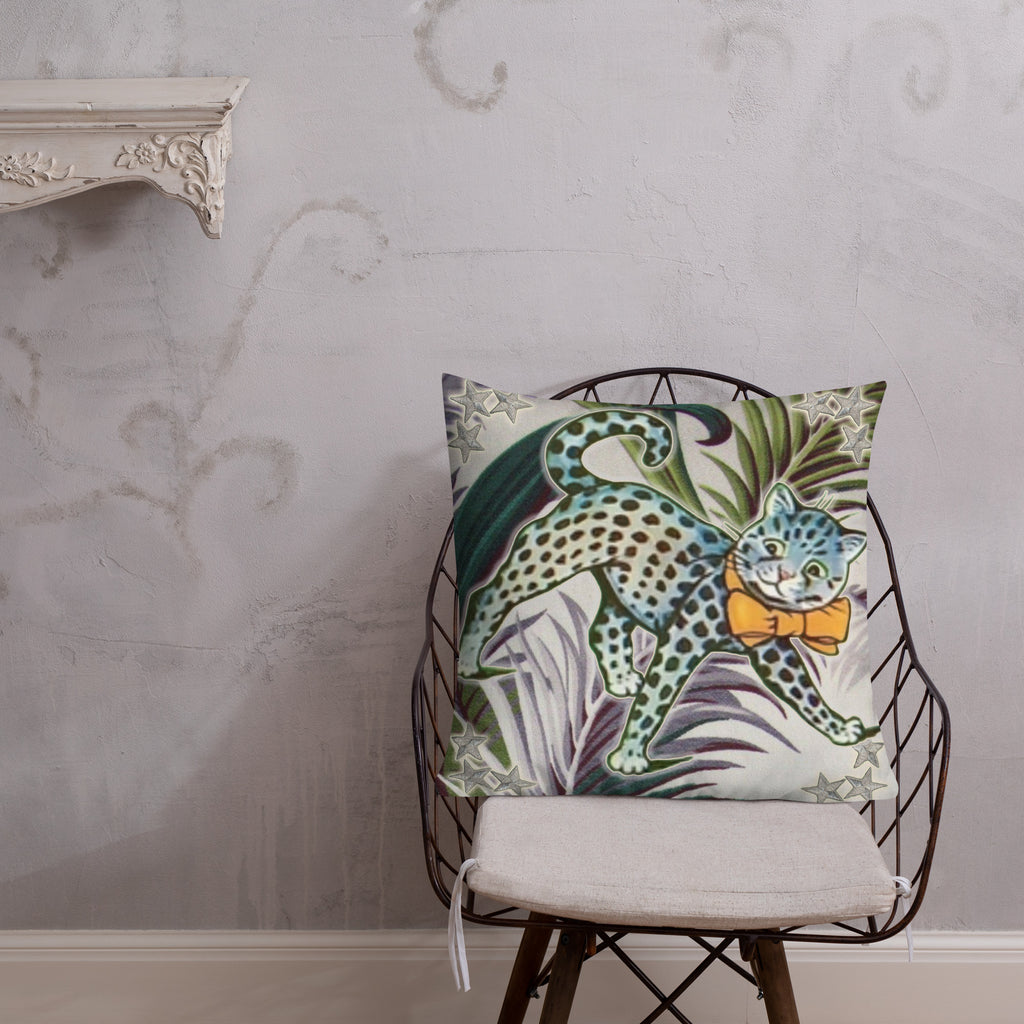 A modern nod to vintage style, this retro pillow features the spotted grey Louis Wain Cat with a yellow bow, framed by bold green tropical foliage. Silver stars accent each corner, and the back mirrors the same vibrant foliage and star-studded artwork, inspired by classic barkcloth textiles for a look that feels both nostalgic and refined.