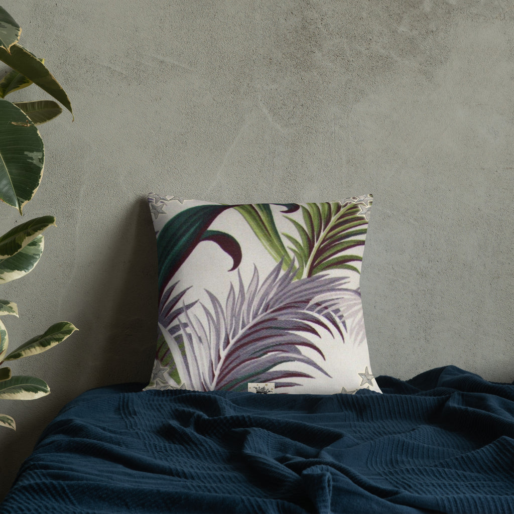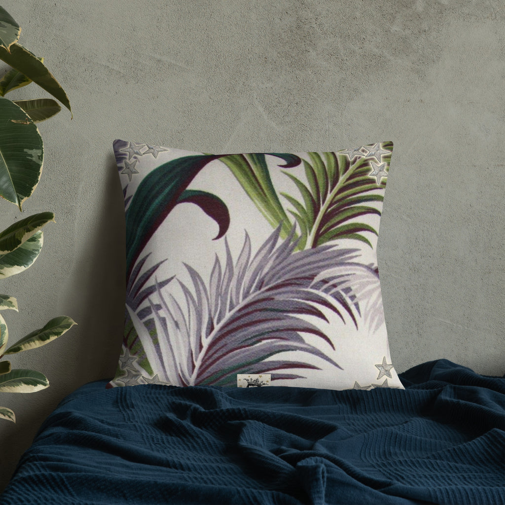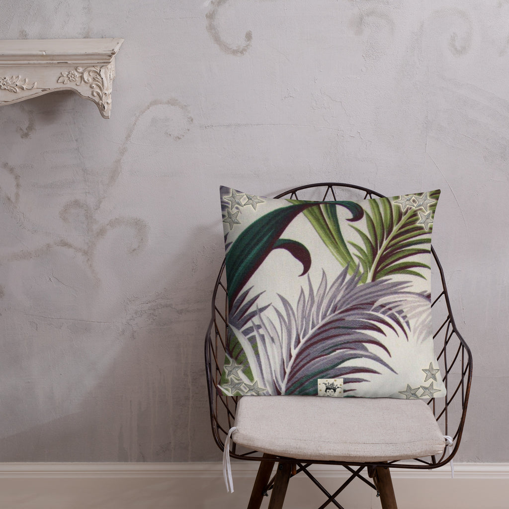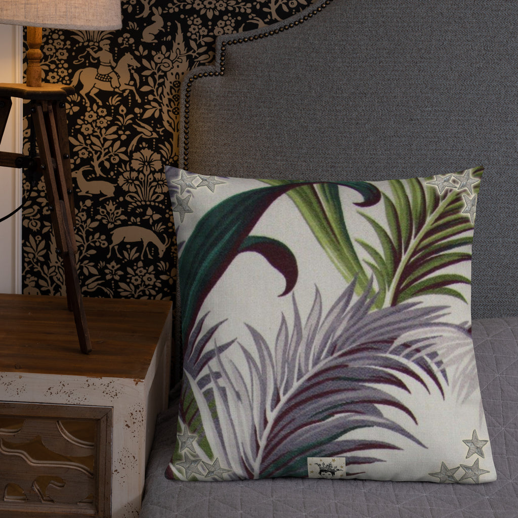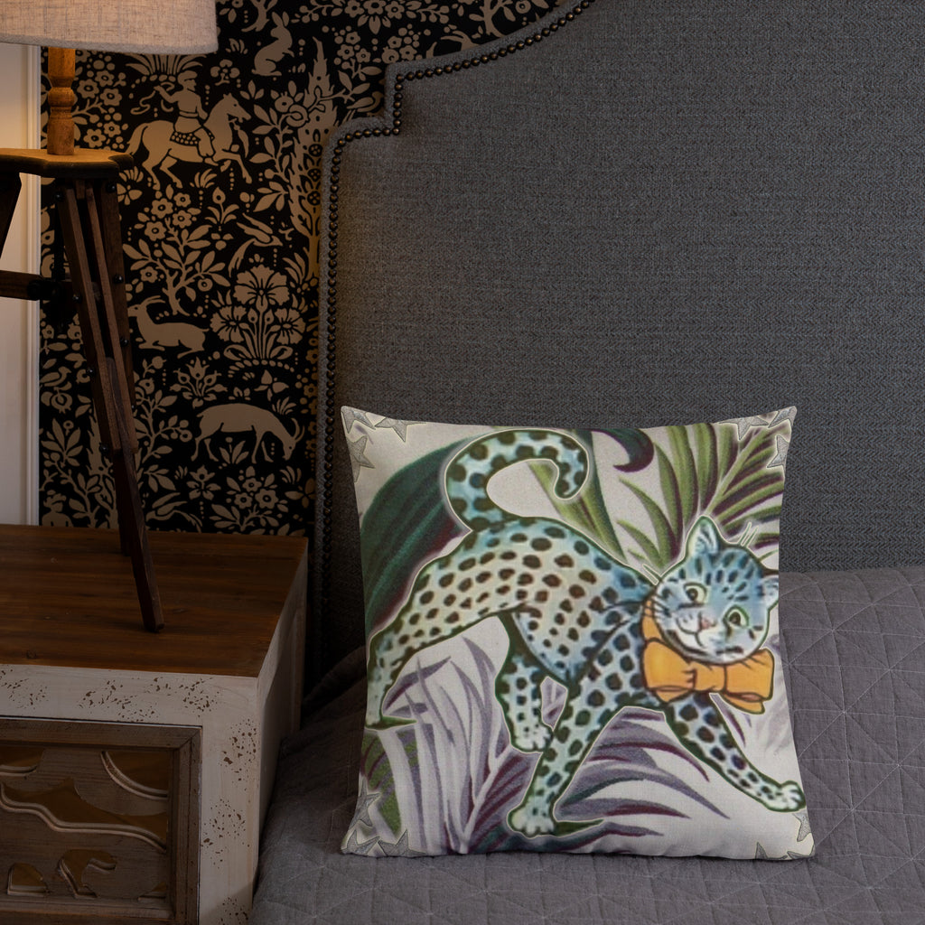 A modern nod to vintage style, this retro pillow features the spotted grey Louis Wain Cat with a yellow bow, framed by bold green tropical foliage. Silver stars accent each corner, and the back mirrors the same vibrant foliage and star-studded artwork, inspired by classic barkcloth textiles for a look that feels both nostalgic and refined.