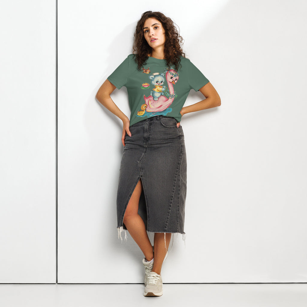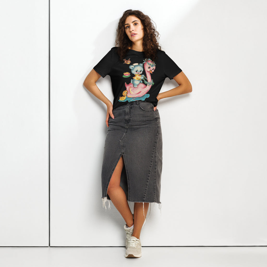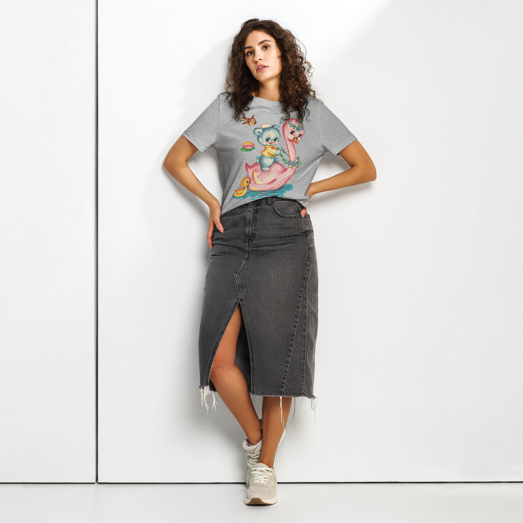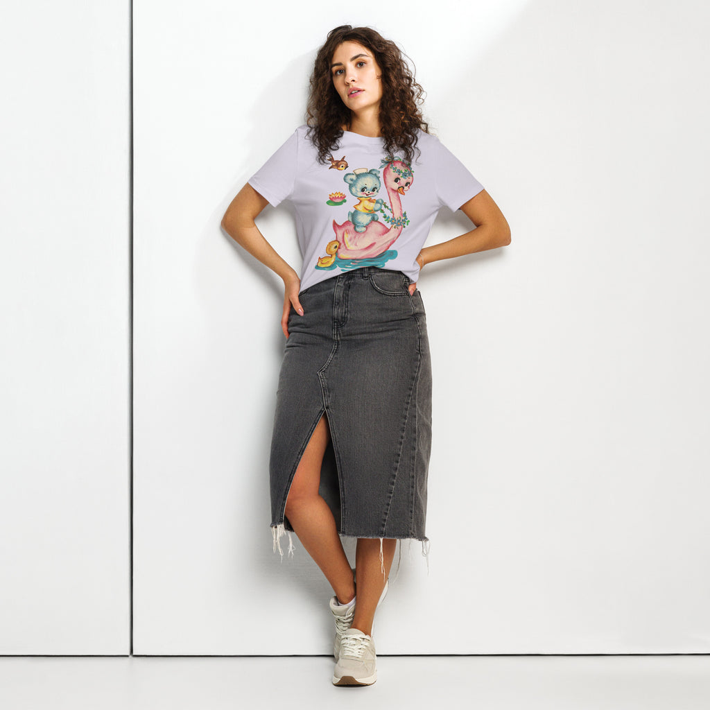 This retro t-shirt features a kitschy, cute vintage illustration of a pastel pink swan gracefully floating with its adorable little bear friend, capturing the whimsical charm of mid-century storybook art. Printed on soft, breathable organic cotton, the design bursts with playful nostalgia, making it the perfect statement piece for anyone who loves quirky vintage style and sweet animal companions.