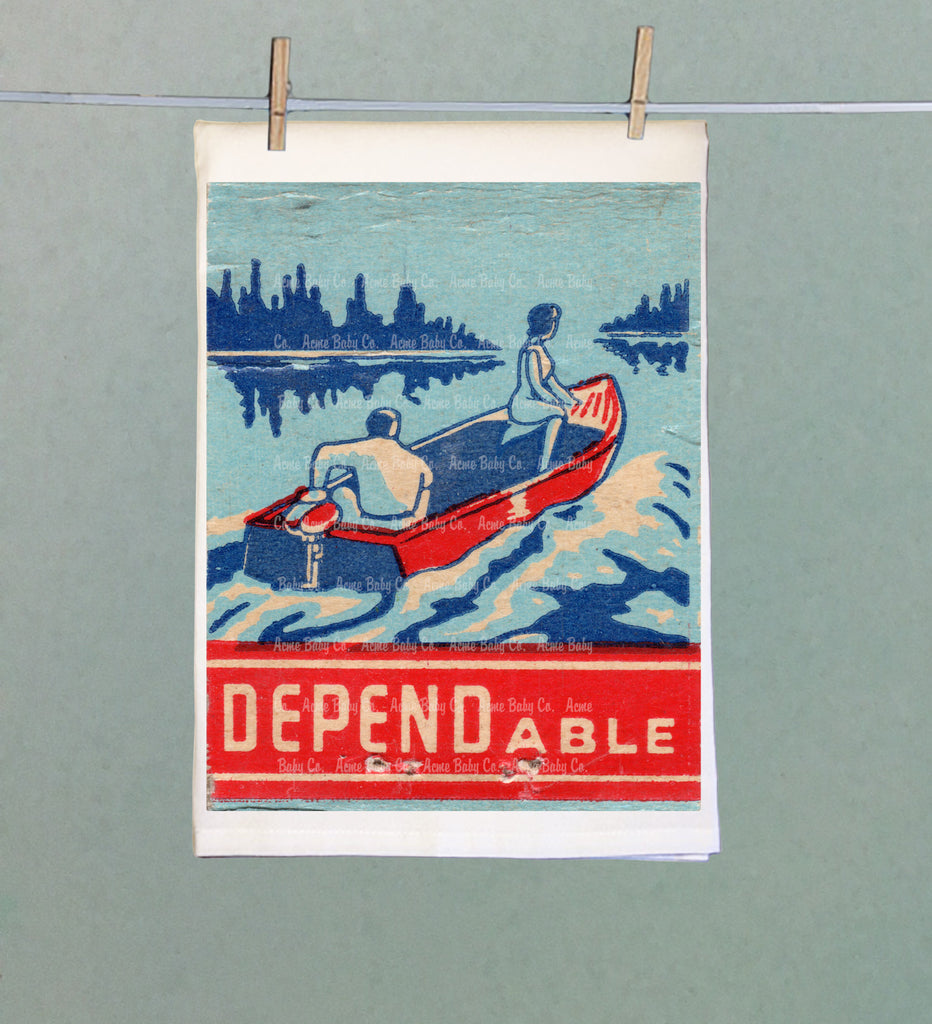 Crafted from 100% organic cotton, this vintage-inspired tea towel captures a serene 1950s lake scene—a man and woman setting off together in a small motorboat beneath the bold word DEPENDable. Rendered in soft shades of blue, light blue, and red, the nostalgic design evokes simpler days of adventure and trust, calling to mind lazy summer mornings and the quiet beauty of wilderness weekends. A perfectly practical piece with timeless charm, it brings a touch of retro Americana to your kitchen or cabin.