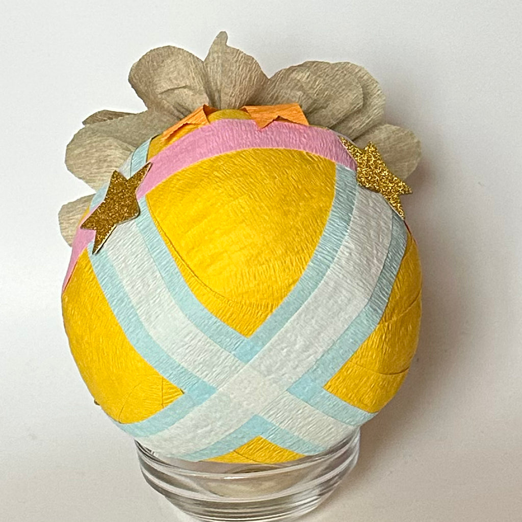 Unwind layers of a variety of colorful crepe paper ribbons to reveal precious vintage and vintage-inspired keepsakes tucked carefully within this beautifully handmade surprise ball. A memorable for kids and adults.