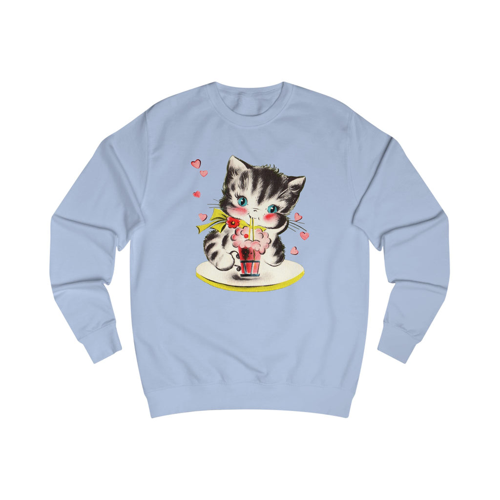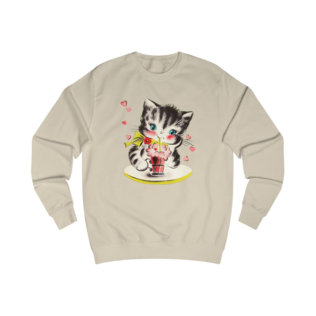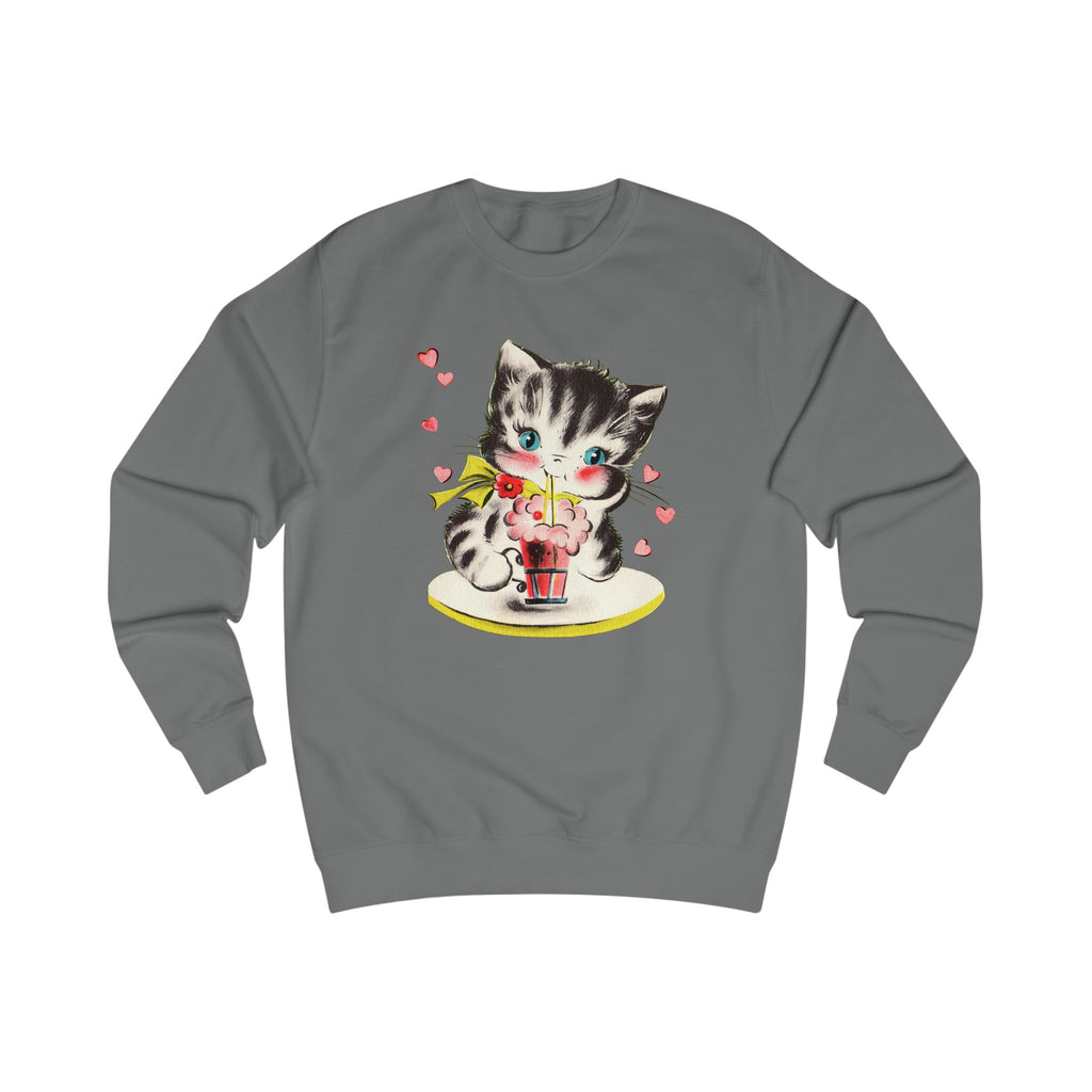 Sip into sweetness with our Milkshake Kitty Retro Sweatshirt! This charming design features a vintage illustration of an adorable gray kitty cat enjoying a delightful pink milkshake, surrounded by playful pink hearts that capture the nostalgic charm of classic diner and mid-century artwork.Crafted for comfort and style, this cozy sweatshirt transforms everyday casual wear into a whimsical fashion statement. The retro-inspired graphic brings a touch of playful romance and kitty cat cuteness to your wardrobe, perfect for those who love vintage illustrations and quirky, sweet-themed designs.Whether you're lounging at home, running errands, or meeting friends, this sweatshirt is sure to bring smiles and spark conversations. Embrace your inner cool cat and add a splash of vintage fun to your outfit!